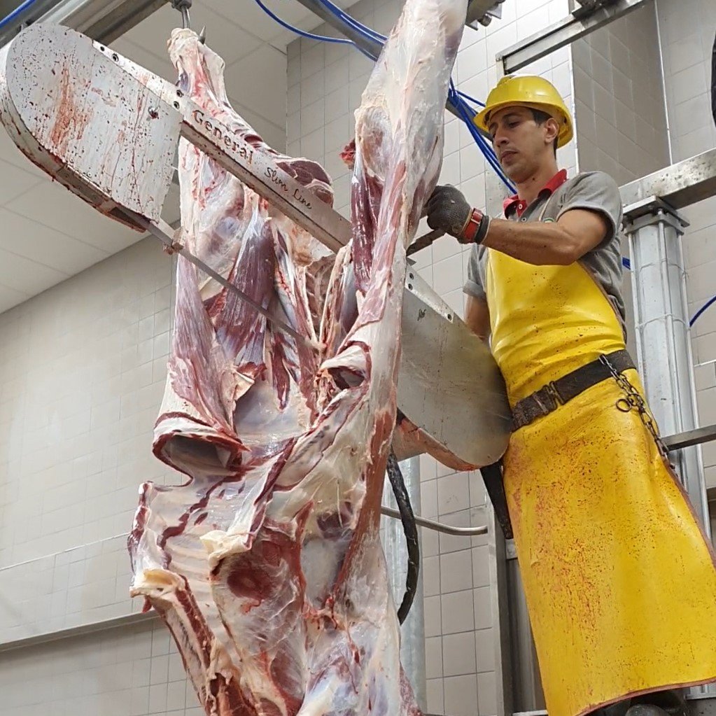 Slim Line carcass splitting saw, ideal for use in narrow spaces with compact design. High-speed cutting, clean cut surface, automatic lubrication system. Stainless steel saw blade.